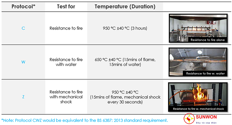 - Đoạn cáp 500mm được tiếp xúc với ngọn lửa ở 650°C trong thời gian 15 phút;